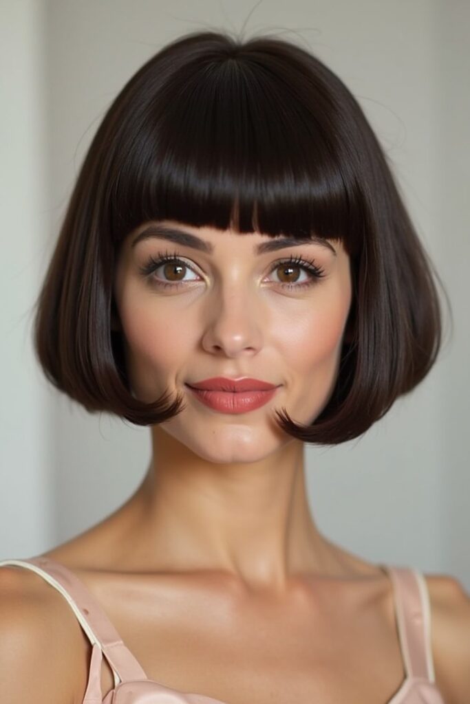 The Pageboy is a smooth, structured style that turns heads. Perfect for medium-length hair, it features straight strands curled inward at the ends and often includes bangs.