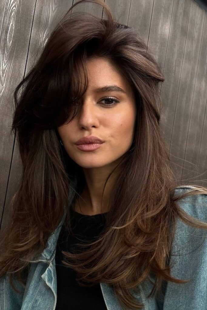 To achieve this look, request long layers with subtle bangs from your stylist that gently highlight your facial features.
