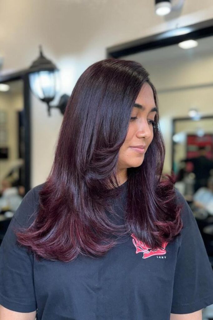 The rich color infuses a contemporary edge, while the smooth layers offer a touch of sophistication. Begin with a base of dark plum dye, then incorporate long layers for added dimension.