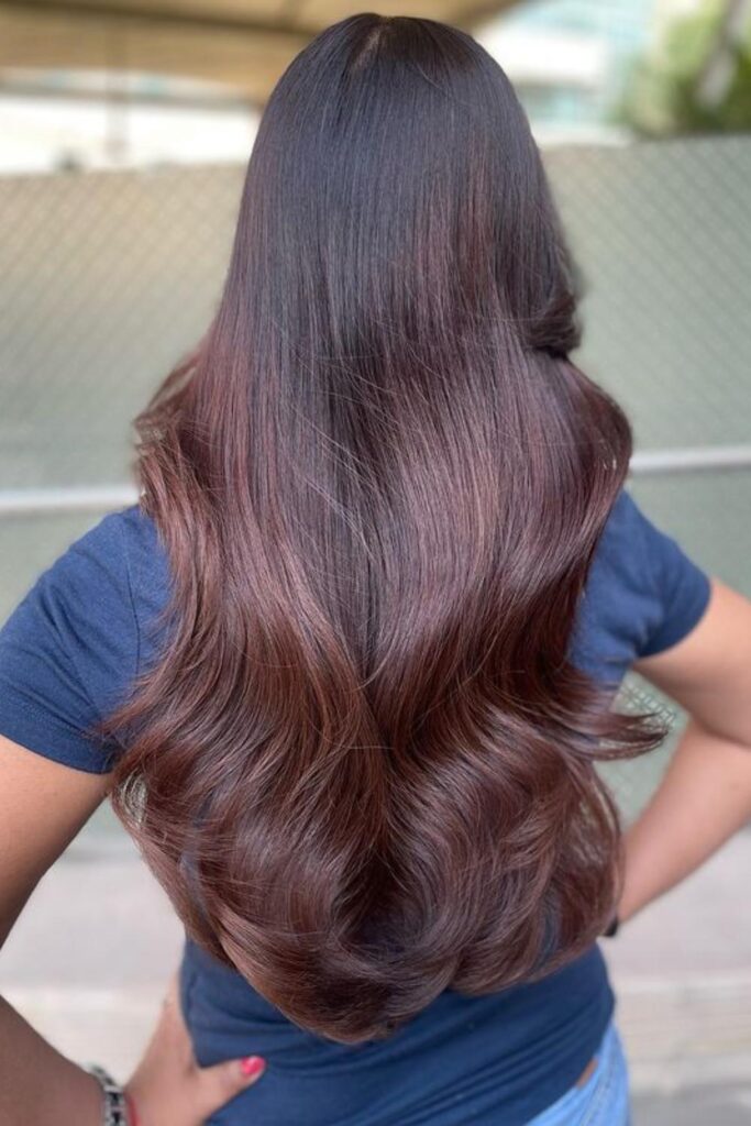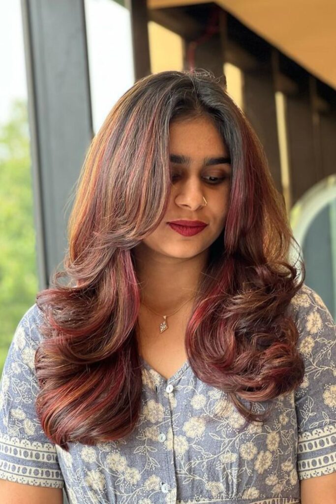 This look enhances your hair’s volume and texture, giving off a bold yet sophisticated vibe. Start with a deep burgundy base and use a curling wand to create loose waves.