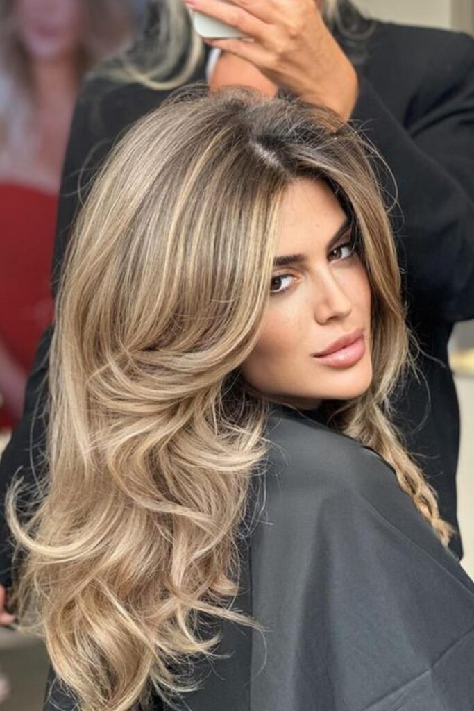 Get ready to turn heads with the trendy ash bronde balayage with layers. This style mixes subtle ashy tones with bronde highlights for a multi-dimensional, eye-catching effect.