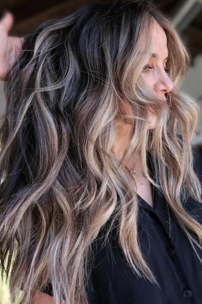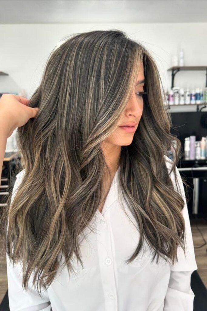 Imagine a hairstyle that combines the natural beauty of ash blonde highlights with deep-rooted dark tones, creating a soft and sophisticated look that’s both chic and easy to maintain.