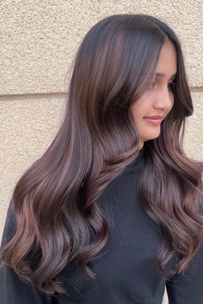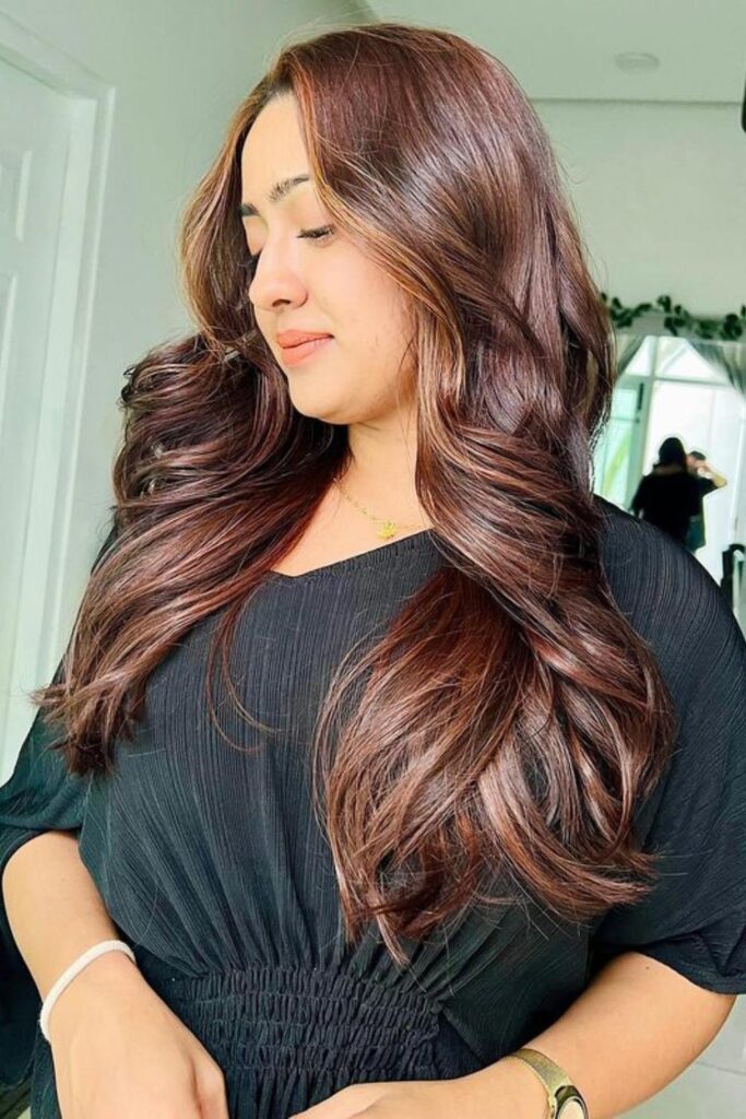To achieve this stunning look, go for cherry balayage highlights and use a round brush while blow-drying to add volume.