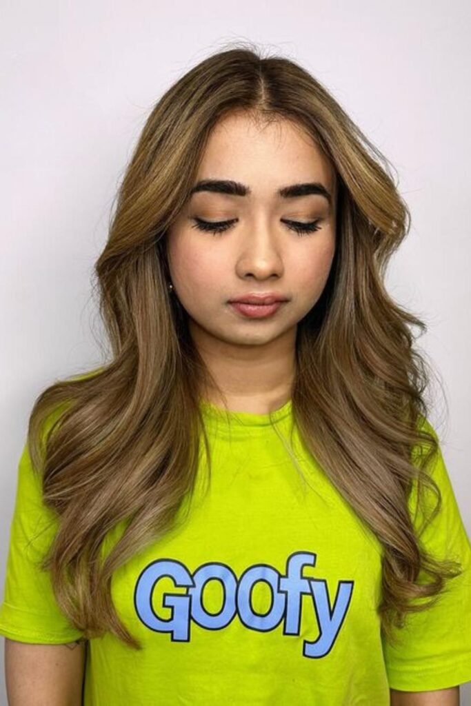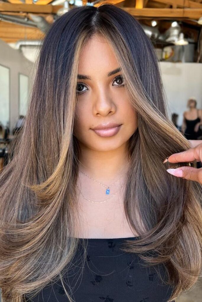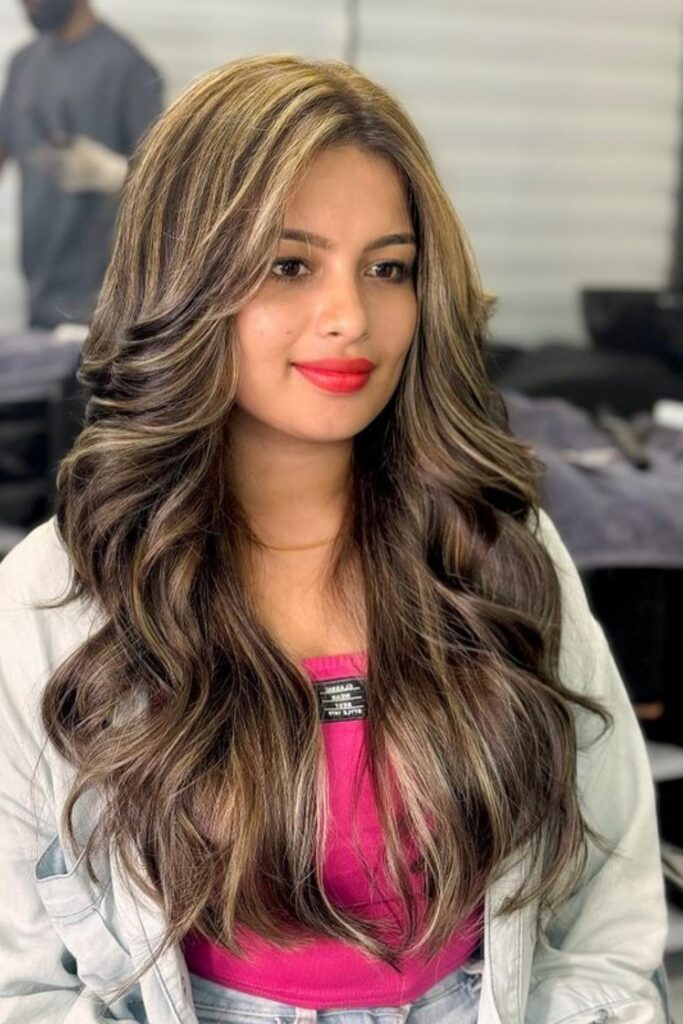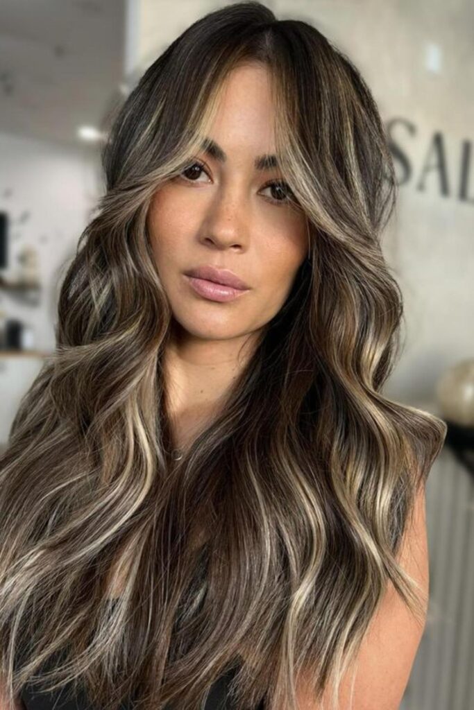 To achieve this look, apply balayage highlights from the mid-lengths of your hair to the ends, concentrating lighter hues around your face for a luminous effect.