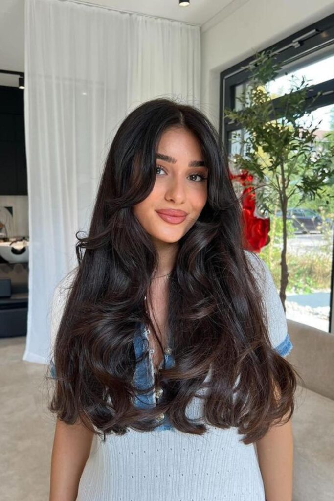 Imagine your hair flowing like rich chocolate, full of life and elegance. This style features voluminous waves that give a natural, luxurious finish, perfect for those with long hair.