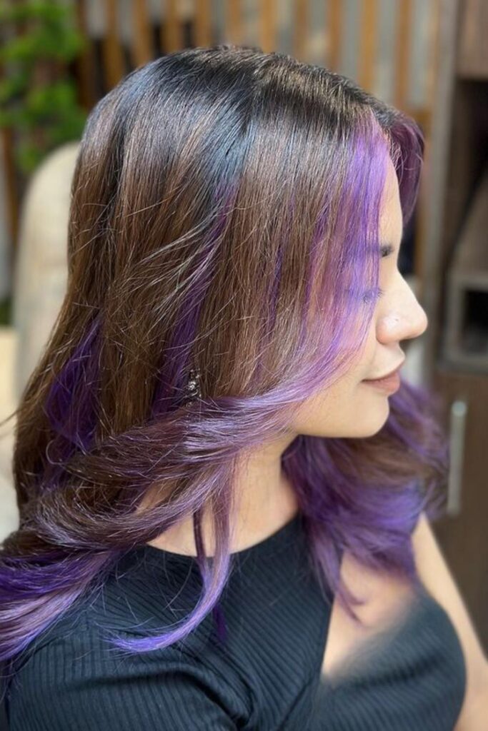This look combines rich brown hair with peekaboo purple highlights, adding a fun twist. The purple highlights are tucked underneath and near the front, peeking through when you move.
