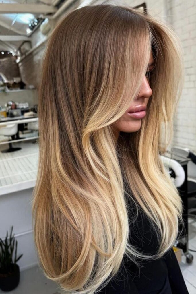 Imagine long, subtle layers that dance gently in the breeze, thanks to delicate golden blonde balayage highlights.