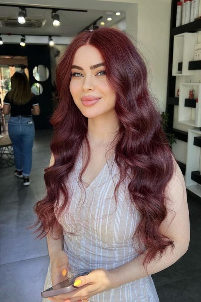 This look features deep burgundy tones that beautifully enhance long, wavy hair, making it perfect for those with fair to medium skin tones.