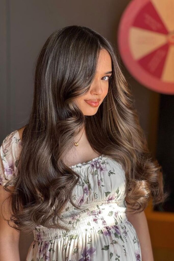 32. Classic Brunette Waves with Caramel Highlights