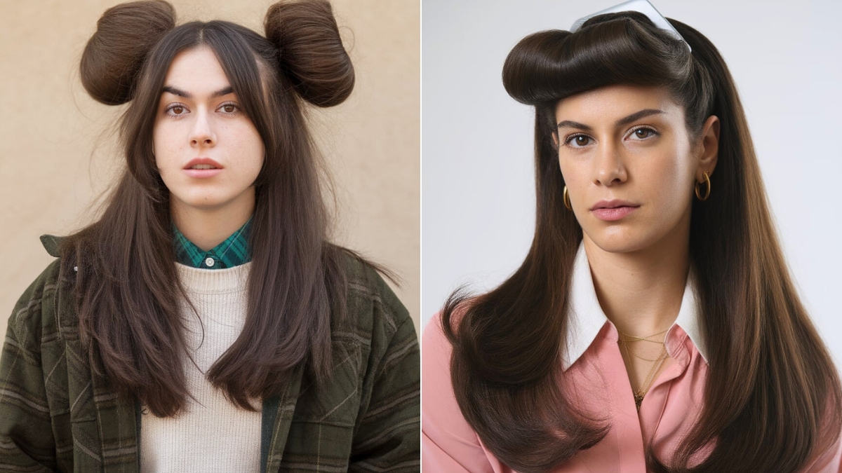 Channel the 90s with playful double ponytails that add a youthful and vibrant flair. Begin by parting your hair down the middle. Gather each section into a sleek ponytail, securing them high on either side of your head.