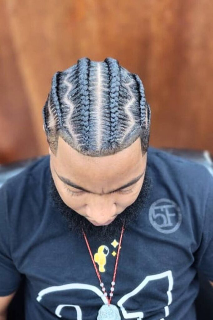 For a modern twist on traditional styles, consider the Wavy Line Cornrows. These cornrows feature wavy parting lines that create a dynamic, flowing appearance.