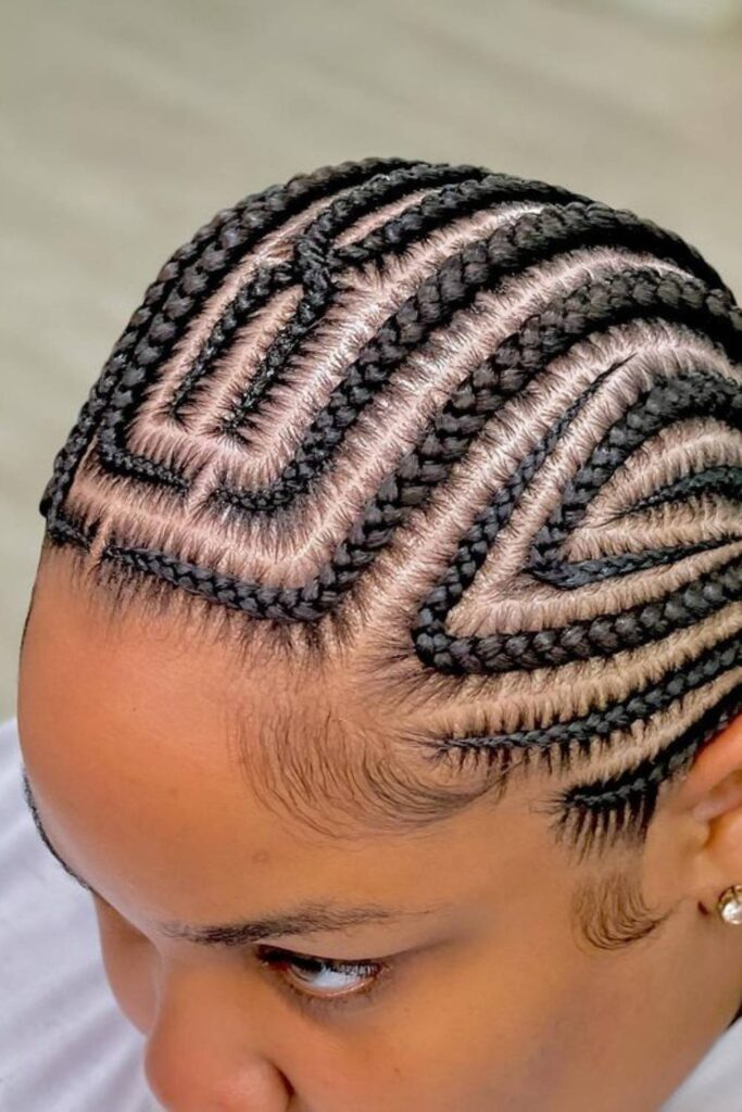 This hairstyle is a true masterpiece of geometric beauty. Imagine cornrows braided with such skill that they form a series of angular and linear patterns, perfectly accentuating the shape of the head.