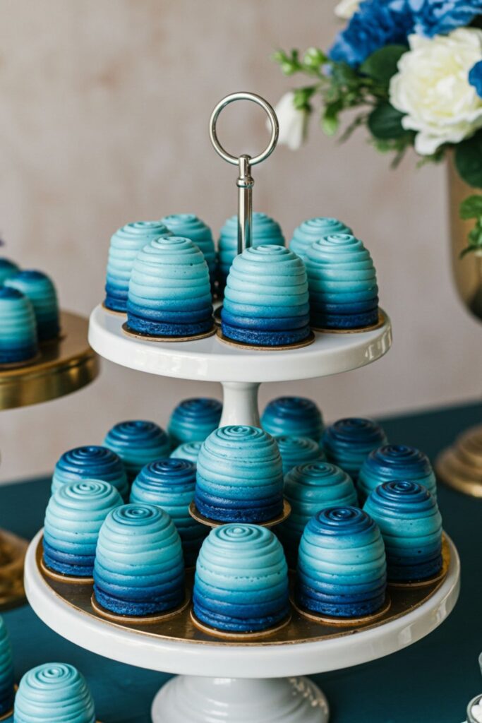 Elevate your dessert game with Blue Ombre Mini Cakes, each showcasing a stunning gradient of blue from light to deep navy.