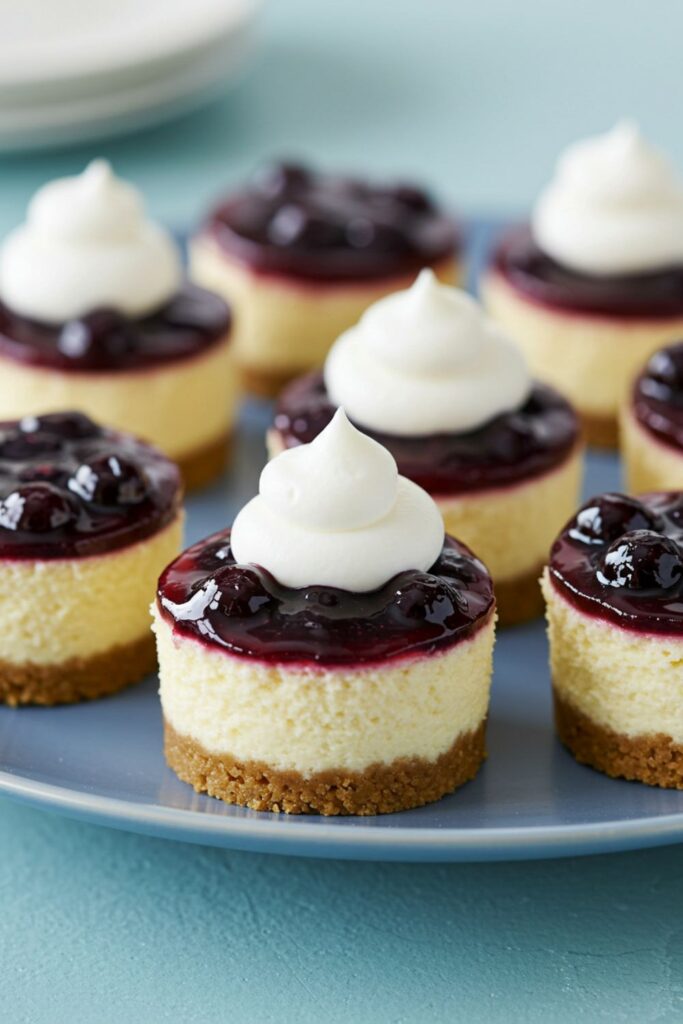 Offer a burst of elegance with mini cheesecakes, topped with a layer of vibrant blueberry compote.