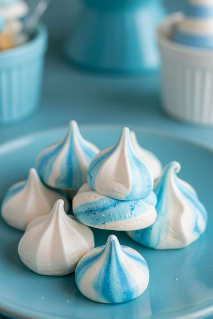 Elevate your dessert table with crisp meringues, swirled in blue and white stripes that blend beautifully.