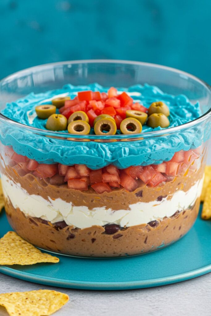 Start with blue-dyed cream cheese, followed by layers of refried beans, diced tomatoes, and garnishes like sliced olives.