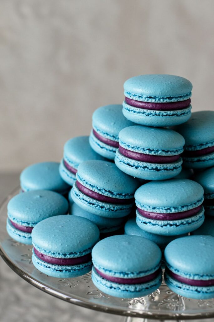 Tiny treats, big delight. These delicate blue macarons are a bite-sized indulgence filled with a luscious blueberry cream.