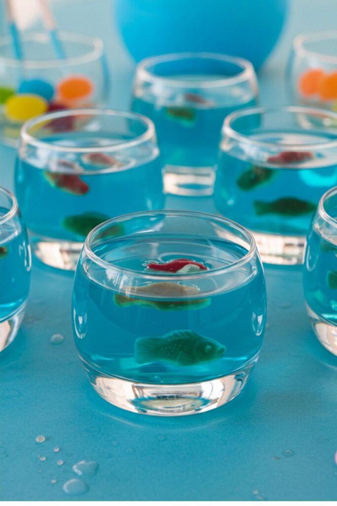 Serve vibrant blue gelatin in small, clear bowls, each containing gummy fish suspended within the “water.”
