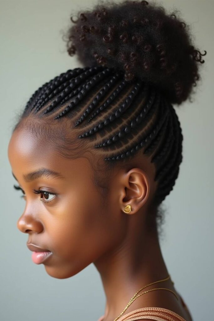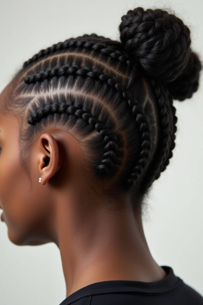 Start by creating tight cornrows along your scalp that lead to a neat bun at the back or top of your head.