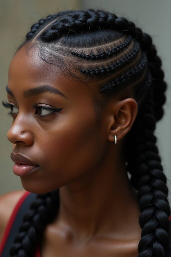 This keeps your hair in place while adding a stylish touch with its asymmetrical design. The side part braids hold snugly against your scalp, while the high ponytail allows for free movement.