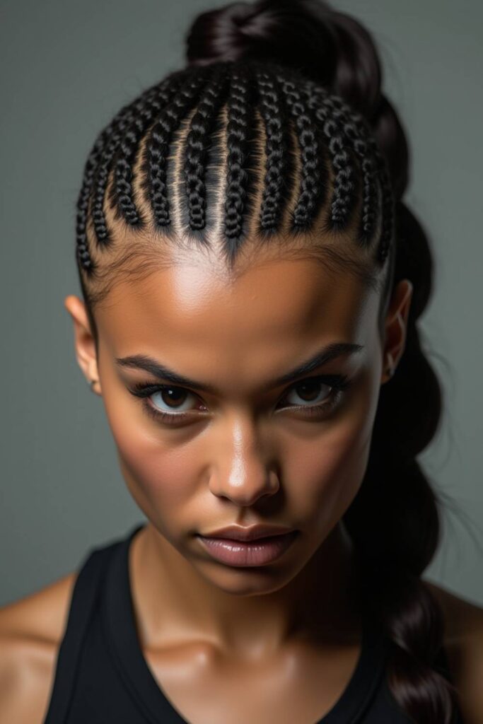 Cornrows prevent flyaways and ensure every strand stays in place. The bun adds extra security, keeping hair off your neck and shoulders.