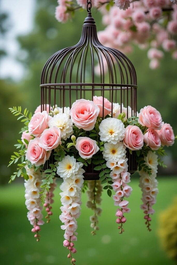 Transform a bird cage into a lush display of pink and white blooms, accentuated by cascading greenery.
