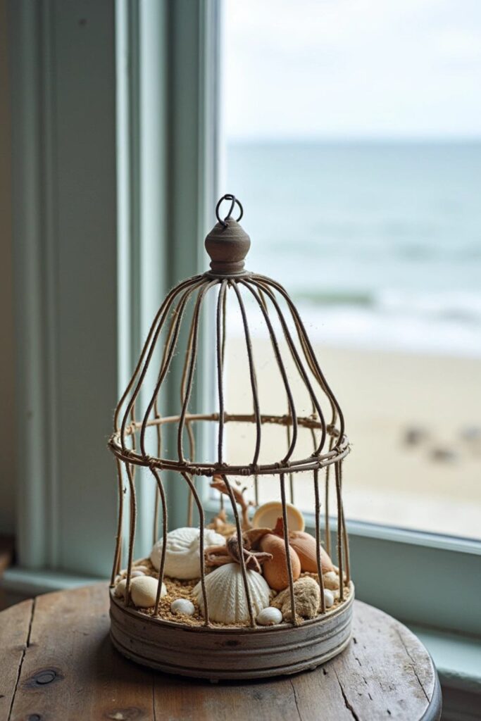 Bring the serenity of the sea indoors with a bird cage filled with sand, seashells, and coral pieces.