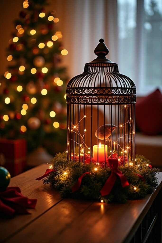 Turn a simple black bird cage into a magical holiday decor piece using glowing string lights, a bright red candle, and lush greenery with festive bows around the base.