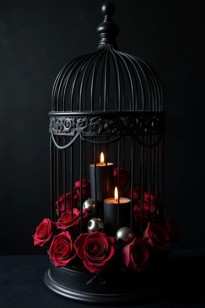 Transform a black birdcage into a statement piece by adorning it with deep red roses and elegant dark candles.