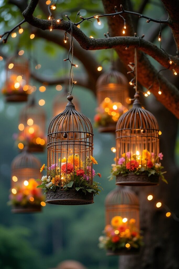 Design an enchanting atmosphere by filling hanging bird cages with colorful flowers and flickering candles.