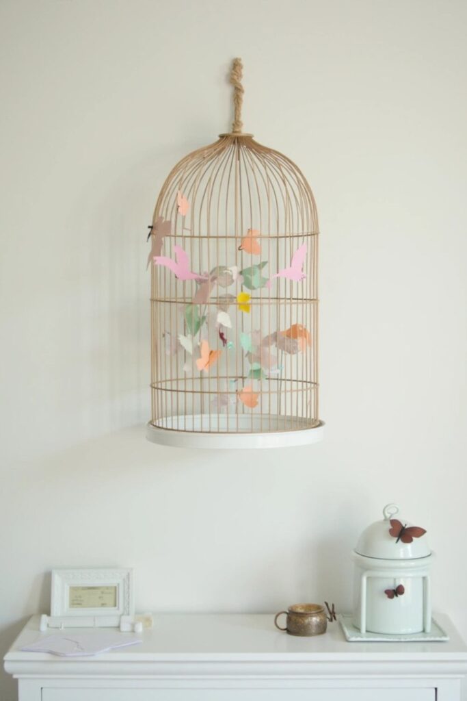Craft a whimsical statement by decorating a minimalist bird cage with floating colorful paper butterflies.