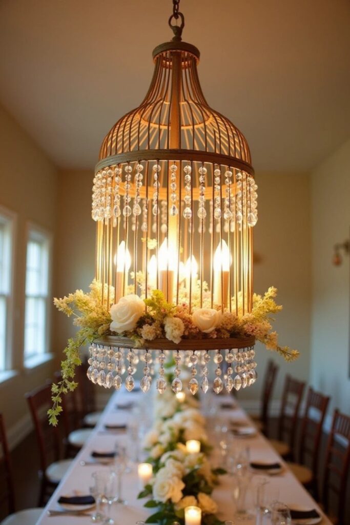 Repurpose a birdcage into a hanging lantern for creating magical moments. Fill it with vivid flowers and glowing candles, letting soft light delicately filter through.