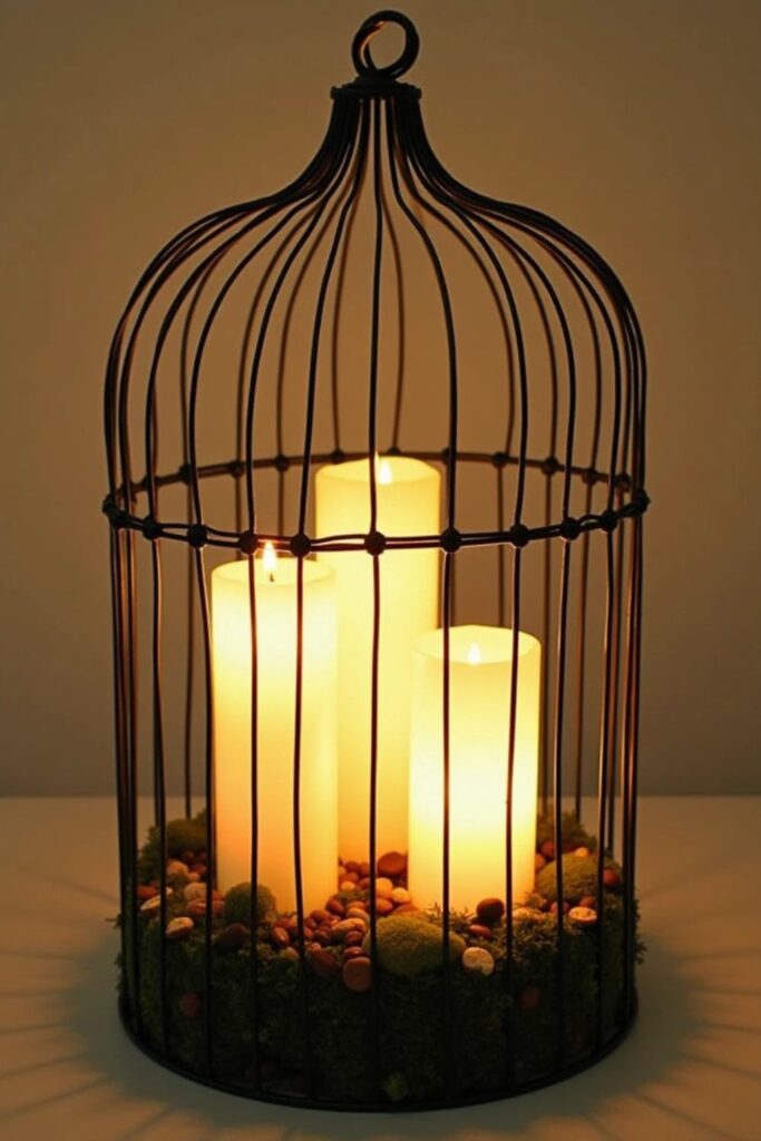 Elevate coziness by turning a birdcage into a stunning candle lantern. Place candles of varying heights inside, then decorate the base with moss, faux flowers, or pebbles.