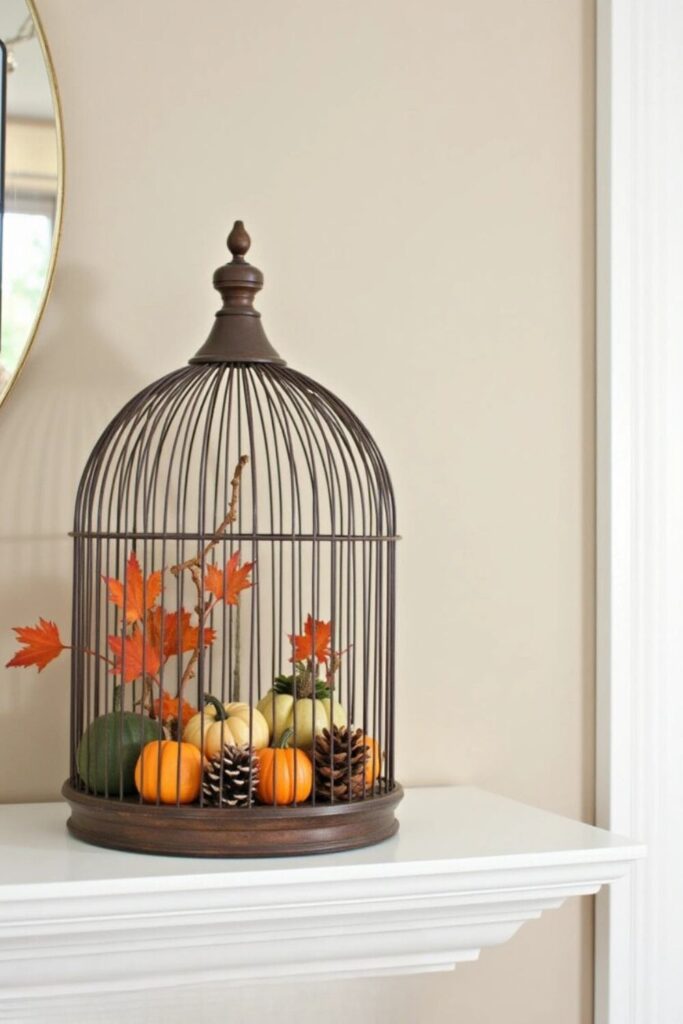 Celebrate fall vibes with a dark bronze bird cage, filled with miniature pumpkins, pinecones, and orange leaves.