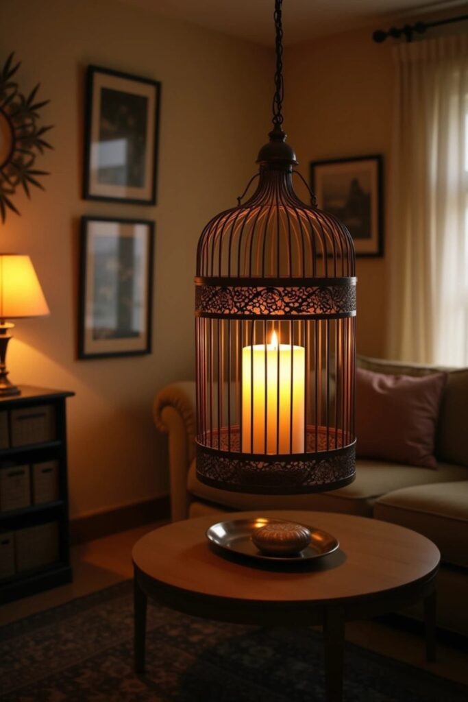 Create a cozy glow with a hanging bird cage featuring intricate patterns. Place a glowing candle in its center, letting its soft light cast inviting shadows in your space.