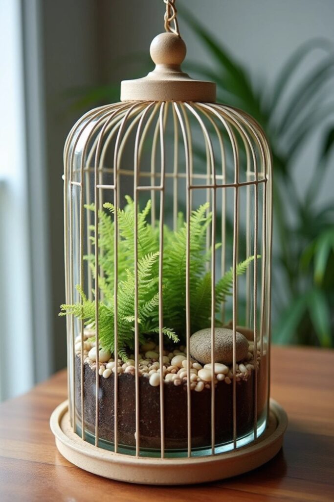 Transform a gold bird cage into a stunning terrarium by filling it with vibrant ferns, smooth pebbles, and rich soil.