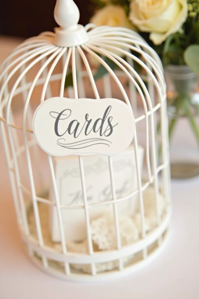 Elevate your wedding reception with a pristine white bird cage as a chic card holder. Add a decorative “Cards” sign to guide guests.