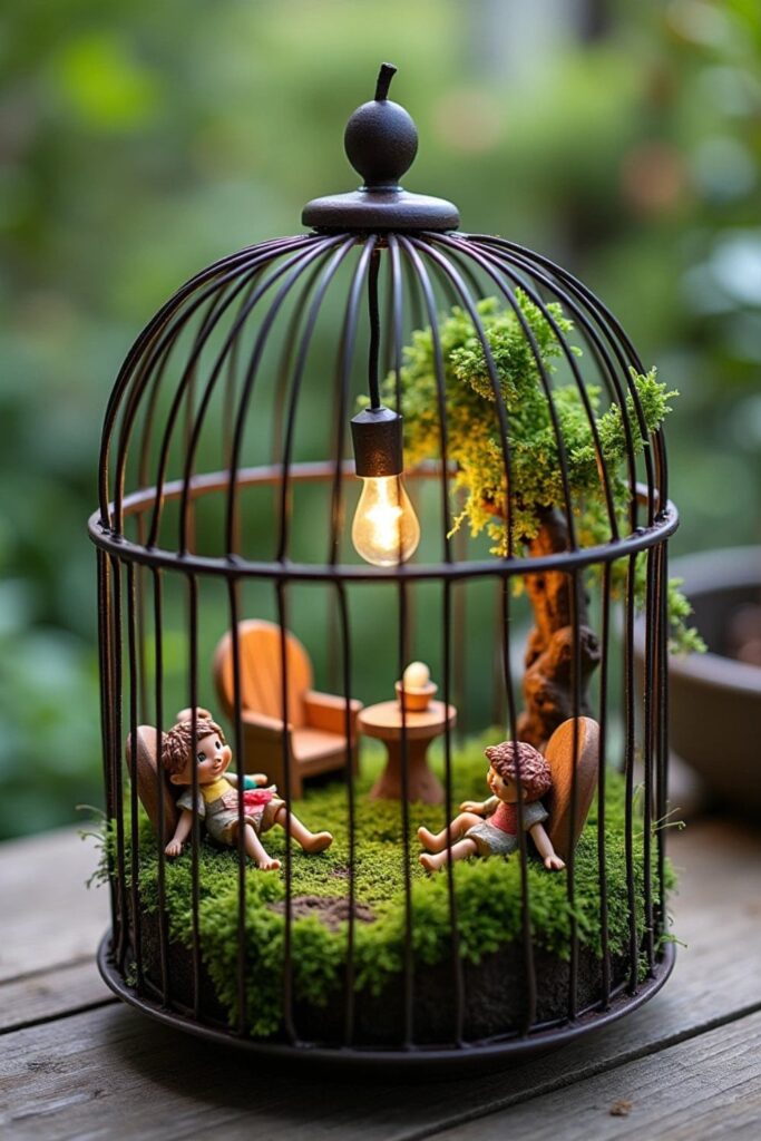 Turn a dark bird cage into a magical miniature garden with a mossy floor, tiny wooden furniture, and playful figurines of children.