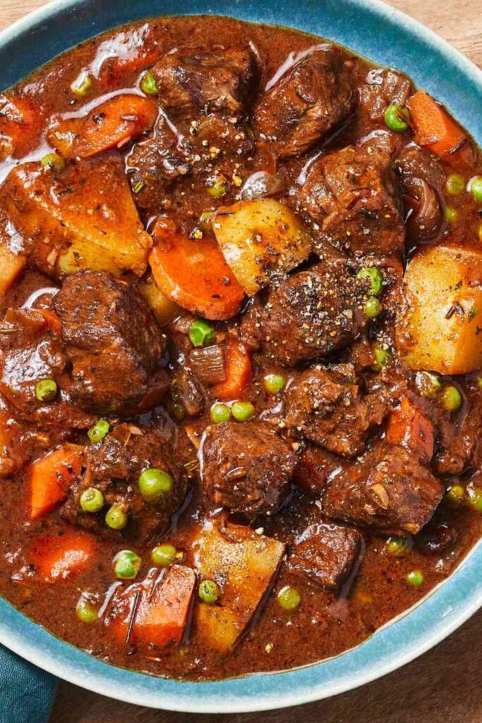 Tender chunks of beef simmer alongside potatoes, carrots, and peas, creating a hearty medley of flavors and textures.