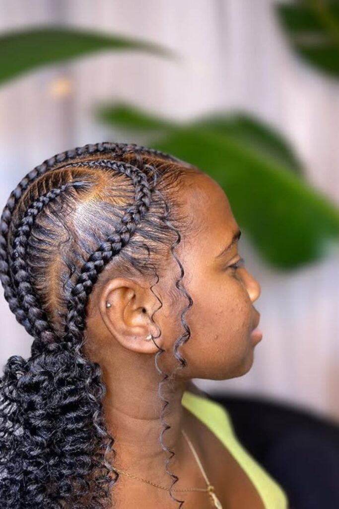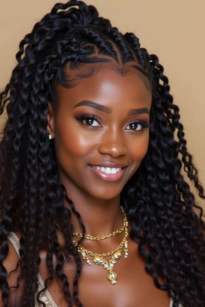 Channel your inner queen with goddess cornrow braids! This style blends classic cornrows with soft, wavy or curly extensions, giving a regal and ethereal look.