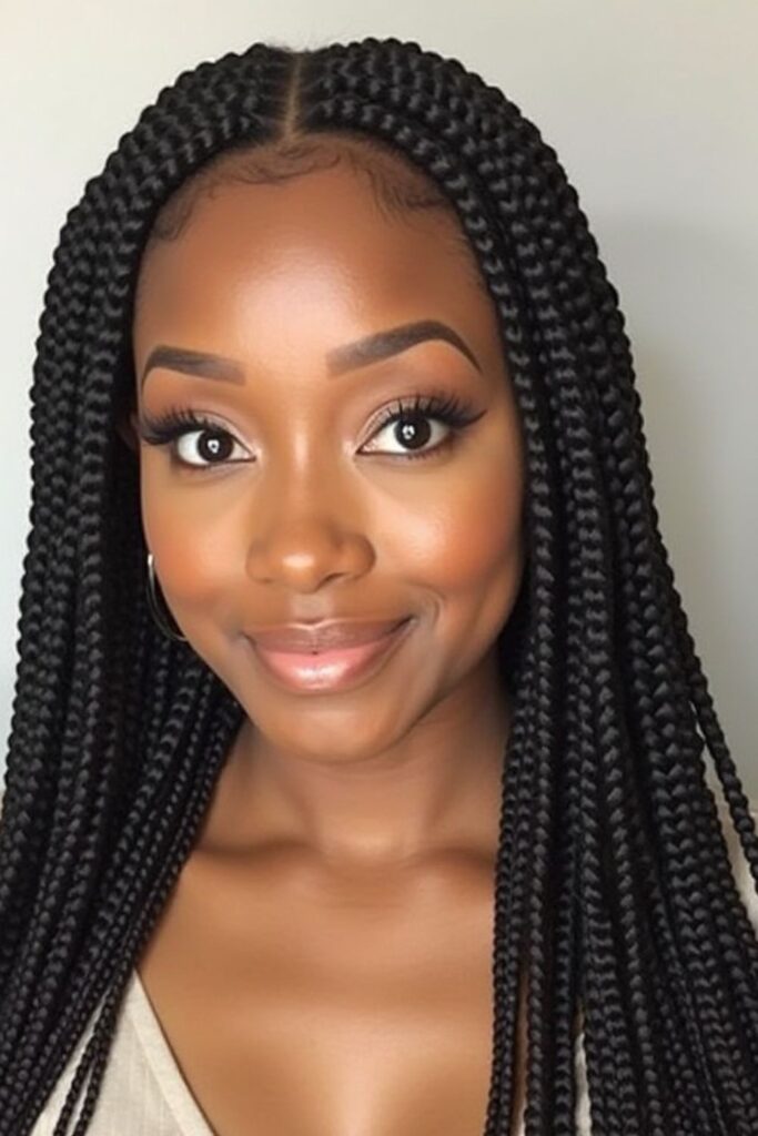 The sharp parting and structured layout make it a trendy choice for those who love detailed, stylish braids.