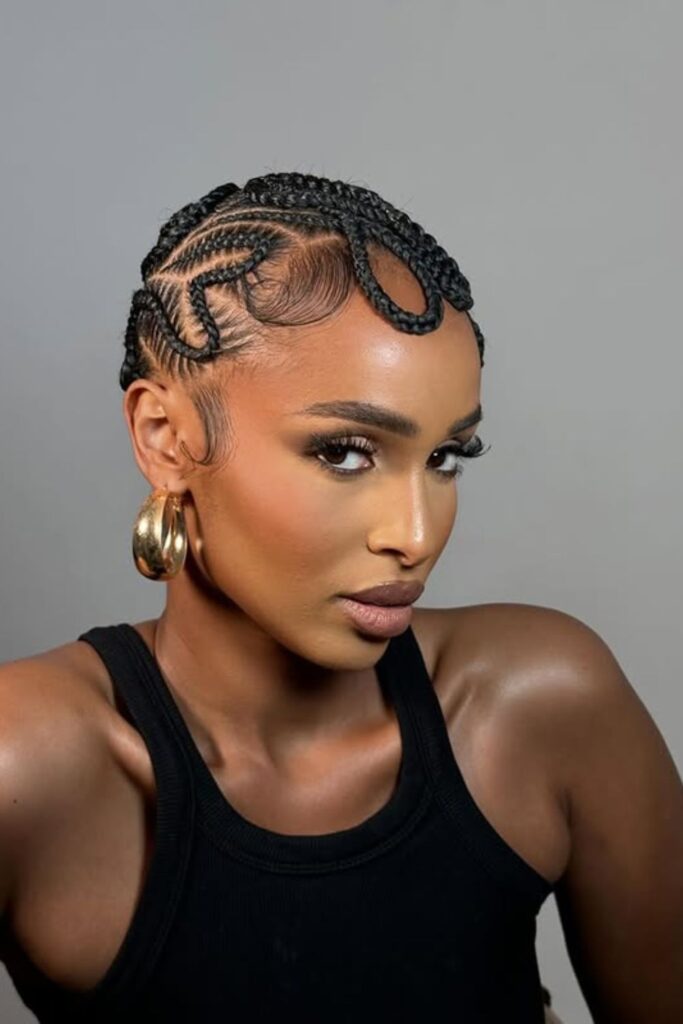 The laid edges and soft curve designs enhance the facial structure, making this look a perfect mix of bold and feminine styling.
