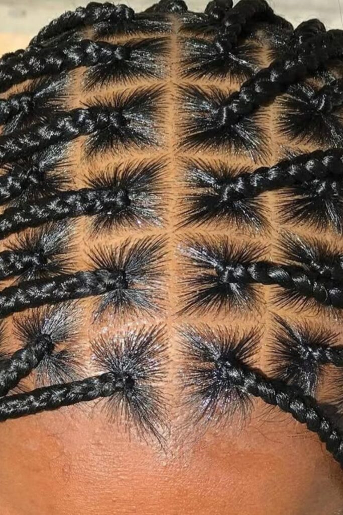 A fresh take on box braids and cornrows, this hairstyle features square-shaped parts with neatly braided sections looped at the base.