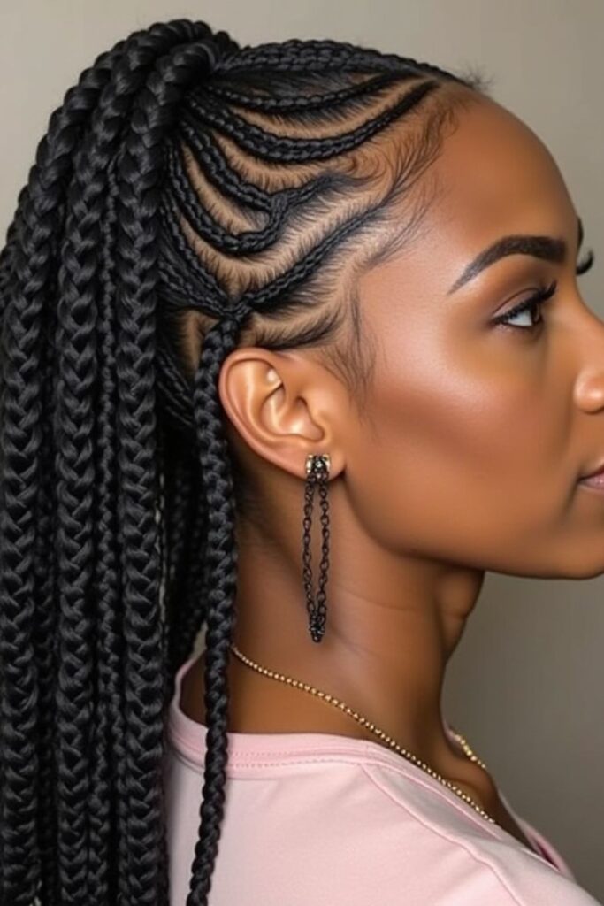 Want the best of both worlds? The half-up, half-down cornrow style lets you enjoy the structure of cornrows with the beauty of long braids.