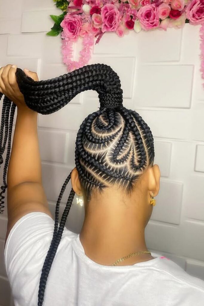 This elevated braided ponytail features intricate swirl cornrows leading up to a thick, structured ponytail.
