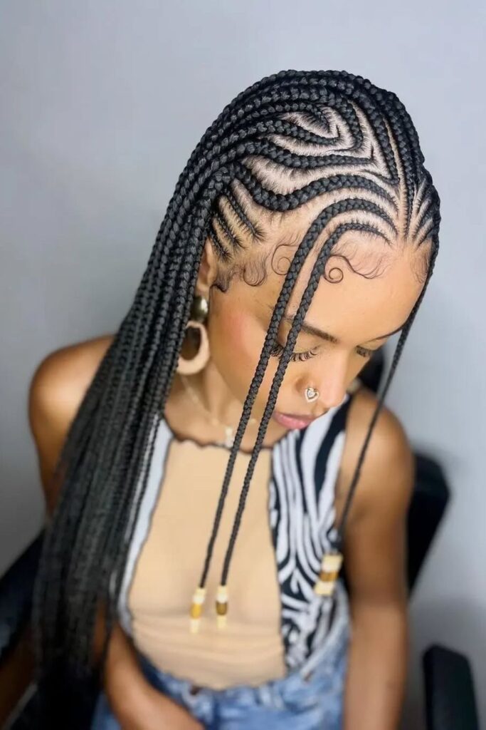 This style features curved, spiral-like cornrows that flow seamlessly into long braids.