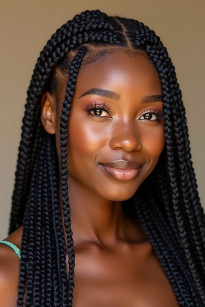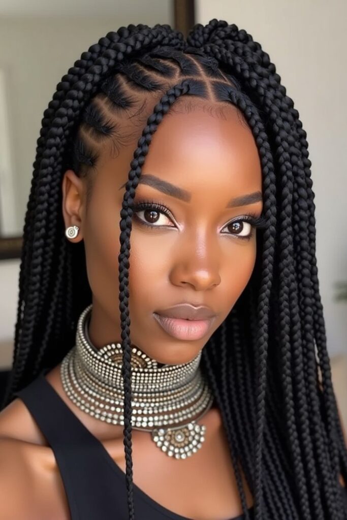 The two beaded front braids add a cultural and playful touch, while the long, flowing braids keep it sophisticated.