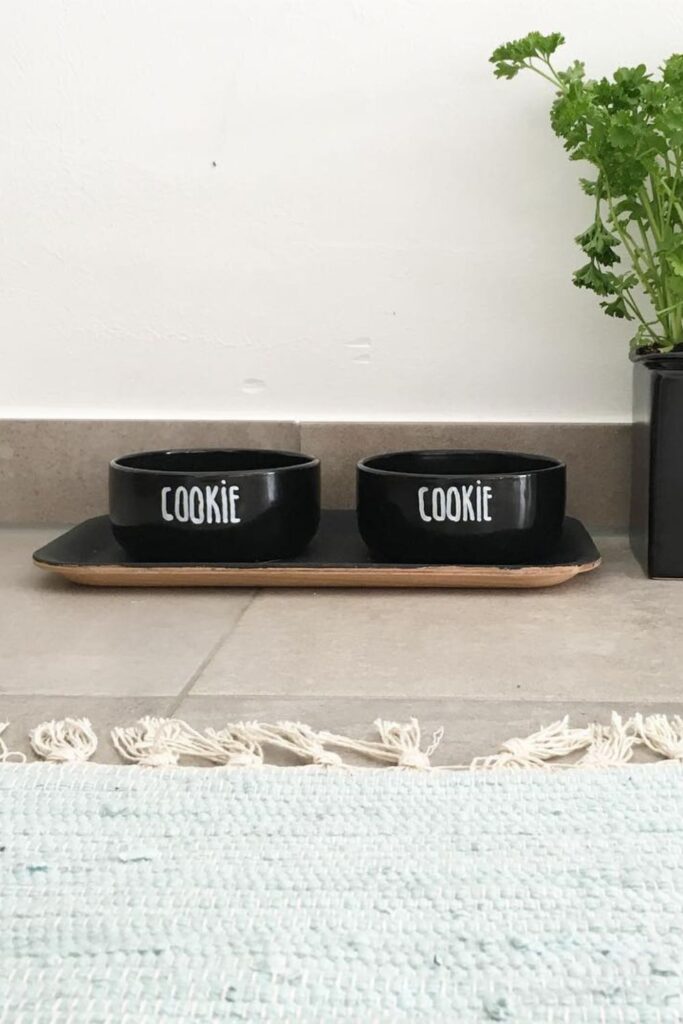 Transform your feeding area with a sleek wooden tray that holds two black ceramic bowls labeled for food and water.