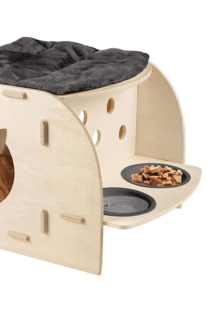Create a multifunctional unit by combining a light wooden cat bed nook with built-in bowls for food and water.
