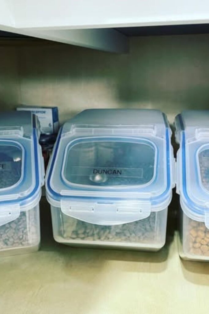 Simplify feeding with a dedicated cupboard featuring containers labeled with each cat’s name.